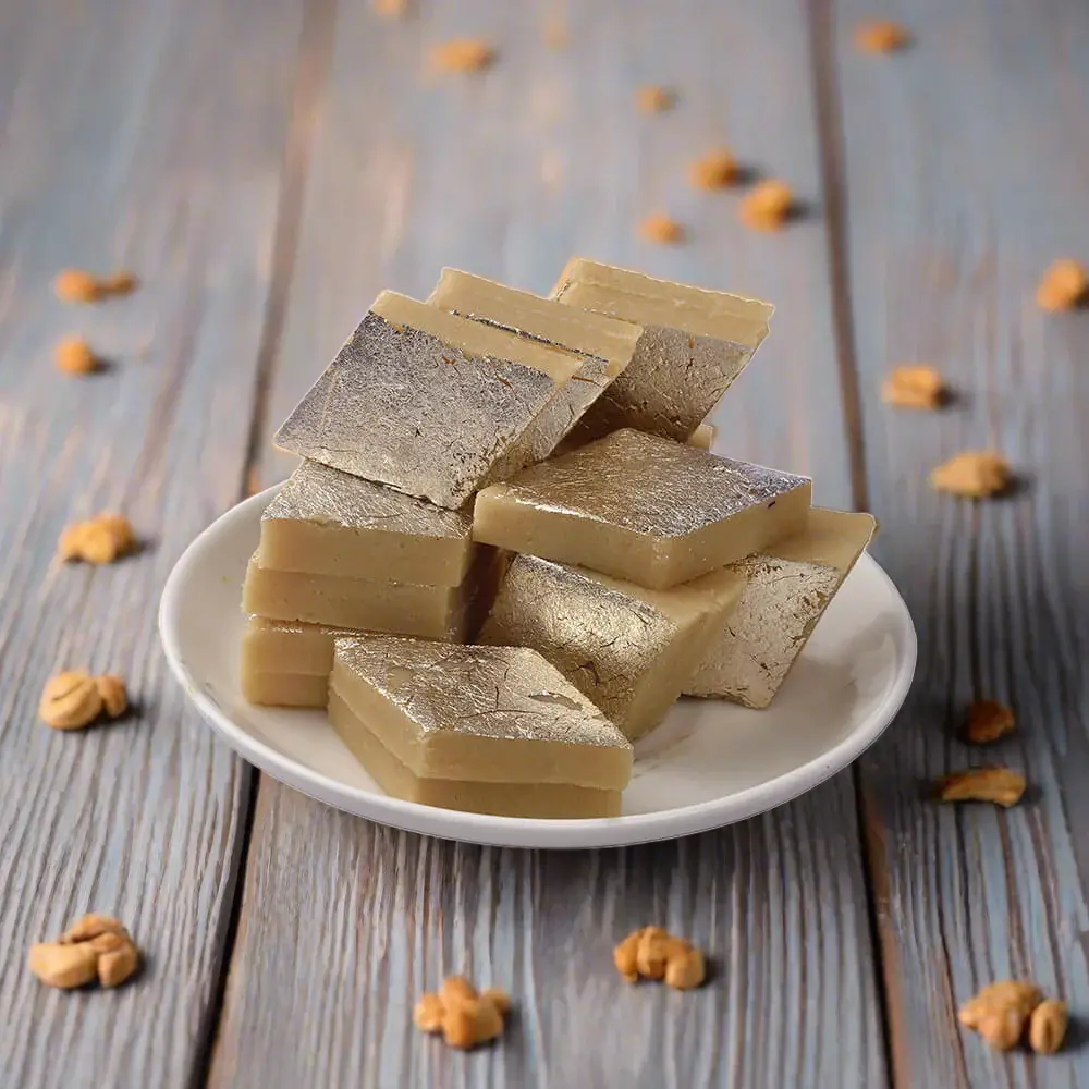 Kaju Katli is a rich and smooth Indian sweet made from cashew nuts, sugar, and ghee. Shaped into diamond-shaped pieces and often garnished with edible silver foil, this delectable treat is a perfect indulgence for festivals and special occasions.